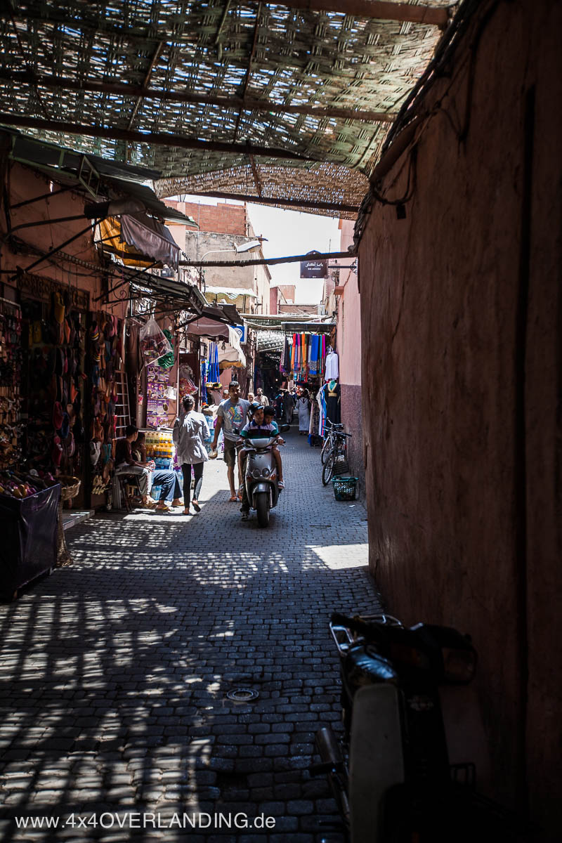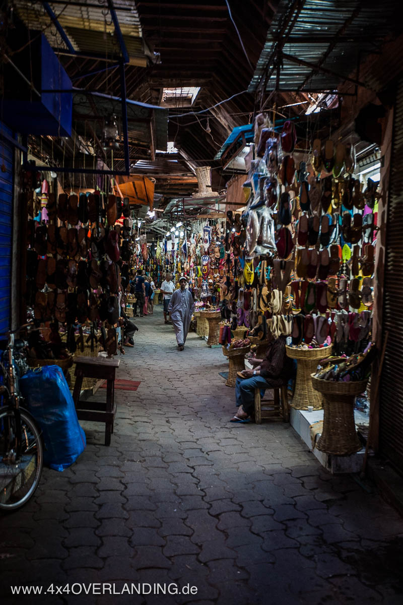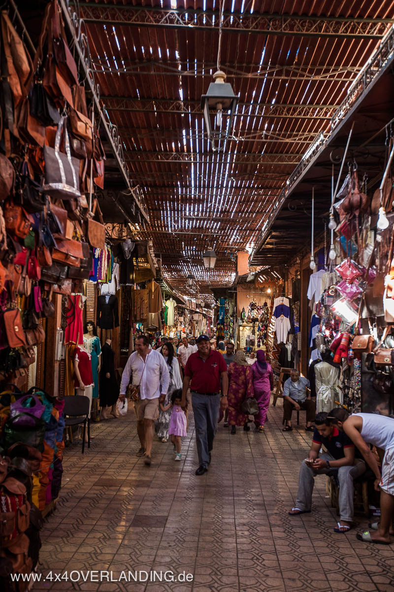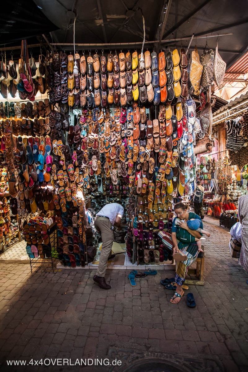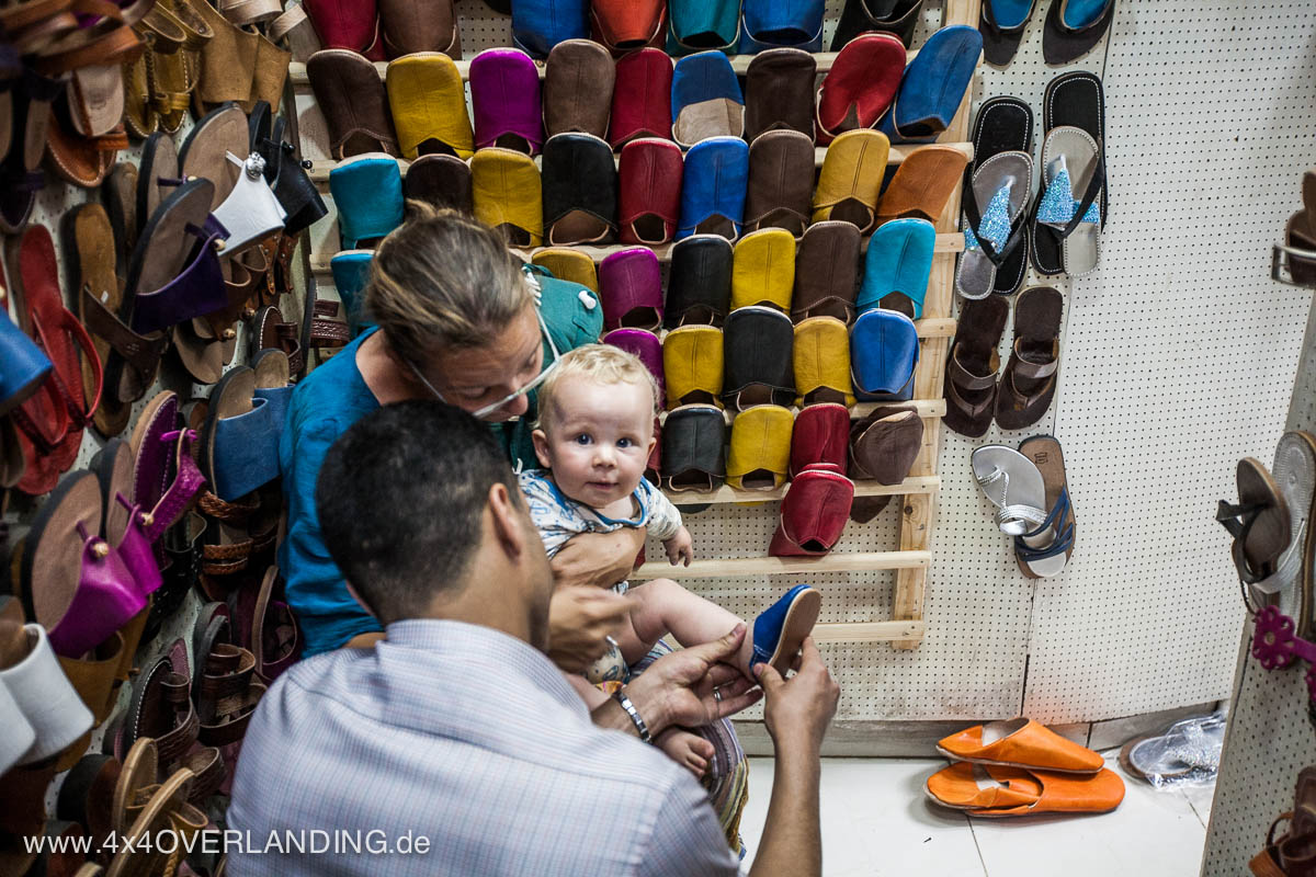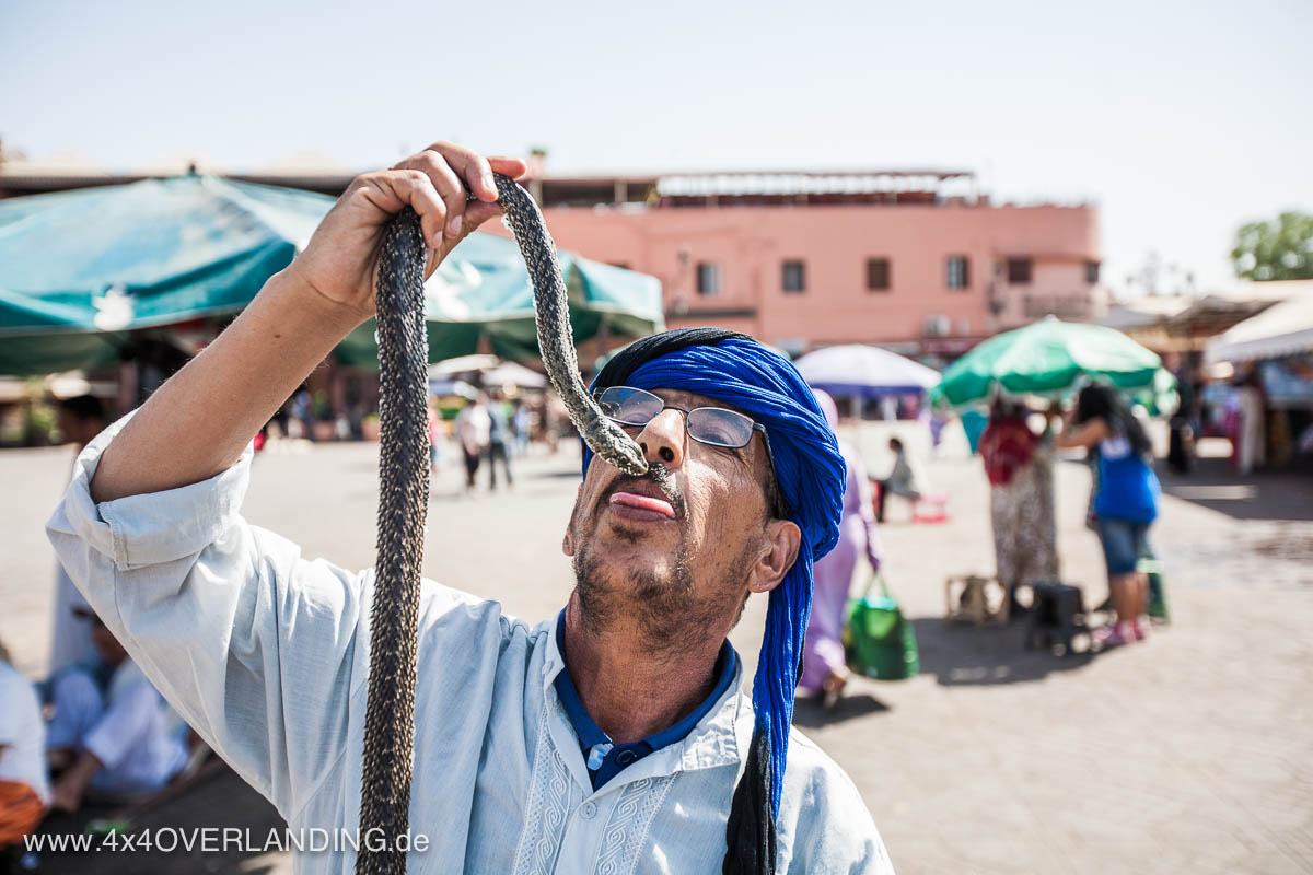 Wir bleiben 2 Nächte und brechen unser lager ab um in die Stadt zu fahren. Es ist scheiße Warm für uns. Wobei die Luftfeuchtigkeit eher das Problem ist. Anyway – es geht rein in die Stadt und wir finden nach einiger Zeit auch den angepeilten Parkplatz. Mo kommt in die Bondolino und ich packt noch 2 Flaschen Wasser ind en Rucksack zur Kamera. Kaum 3 Schritte gemacht schwitz ich schon den Rücken voll. Wir laufen los in Richtung des großen Hauptplatzes bei den überdachten Souks. Wir gönnen und eine frischen O Saft mit Grapefruit und Zitrone für 10Dh pro Person und los gehts, shoppen. Wir laufen los und freuen uns das es doch nicht so touristisch voll ist heute. Nach einigen huntert Metern und ca. 30 Sekunden pro Meter wissen wir auch warum. Wir sind in die falsche Richtung los gelaufen ;-) Also alles wieder zurück. Diesmal finden wir den richtigen Weg und sind ratzfatz in den überdachten Souks. Hier kann man sich 2 Tage aufhalten ohne einen Weg doppelt zu gehen. Wir laufen rum, schauen uns alles mögliche an. Im Lederviertel finde ich eine schöne Tasche die mir gut gefällt und nach einigem Handeln wechselt sie für 320DH den Besitzer. Ich hab zu sehr gezeigt das sie mir gut gefällt. Der Gurt wird noch geändert, bzw. verlängert. Dafür hab ich eine Handgemachte Leder Tasche Für Laptop und was zum schreiben – I like it. Auf die Frage wo es die Schuhe gibt werden wir direkt dorthin geführt, natürlich zu einem Freund, aber am ende ist es doch egal in welchem der vielen Läden man kauft. Ungefähr 4 Verkäufer sind unterwegs und suchen für Mo passende Schuhe. Im 2. Laden und nach gefühlten 45 Minuten hat der kleine Mann endlich seine ersten Schuhe, echtes Leder mit Gummiband und weicher, leicht gepolsterter Sohle. Am Ende des Tages gabs für mich noch eine Hemd aus reinster Baumwolle und für Yvonne ein paar Sandale und 2 weiter Hosen. Sie steht jetzt total auf diese Rockartigen Hosen. Am frühem Abend kommen wir wieder am Hauptplatz aus und dieser hat sich stark verändert. Überall stehen jetzt Fressbuden und es duftet echt sehr sehr gut. Wir sind allerdings platt. BTW – ich hatte auch ne Schlange um den Hals. Nicht ganz freiwillig aber schneller als ich flüchten konnte hatte ich diese umgelegt bekommen und eine Mütze auf dem Kopf. dann noch schnell 2 Bilder gemacht bekommen und wer denkt das wars jetzt – neee. Jetzt wird noch die Hand aufgehalten und sie wollten mindesten 20DH bekommen – 10 gabs.